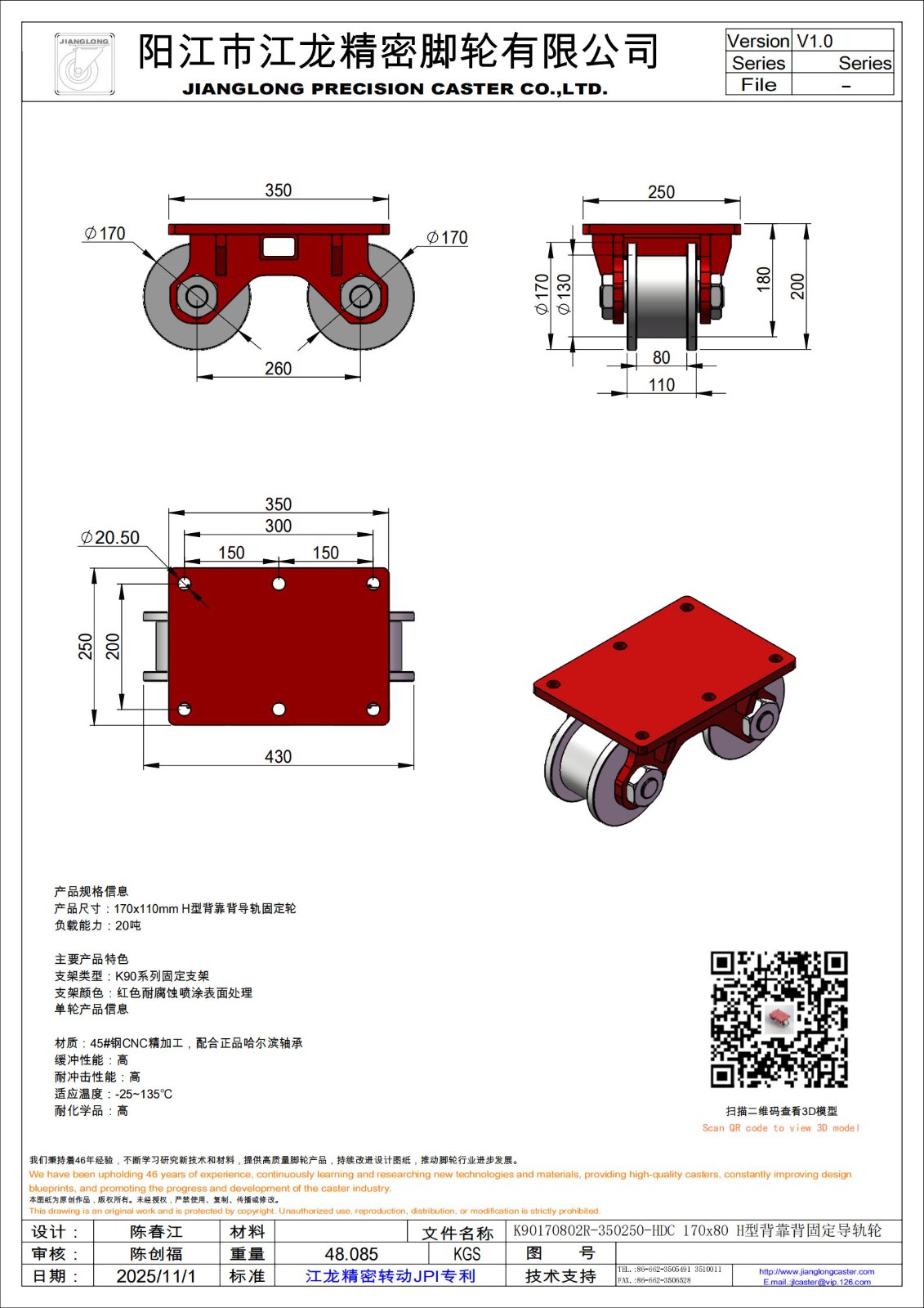 K90170802R-350250-HDC 170x80 H型背靠背固定导轨轮