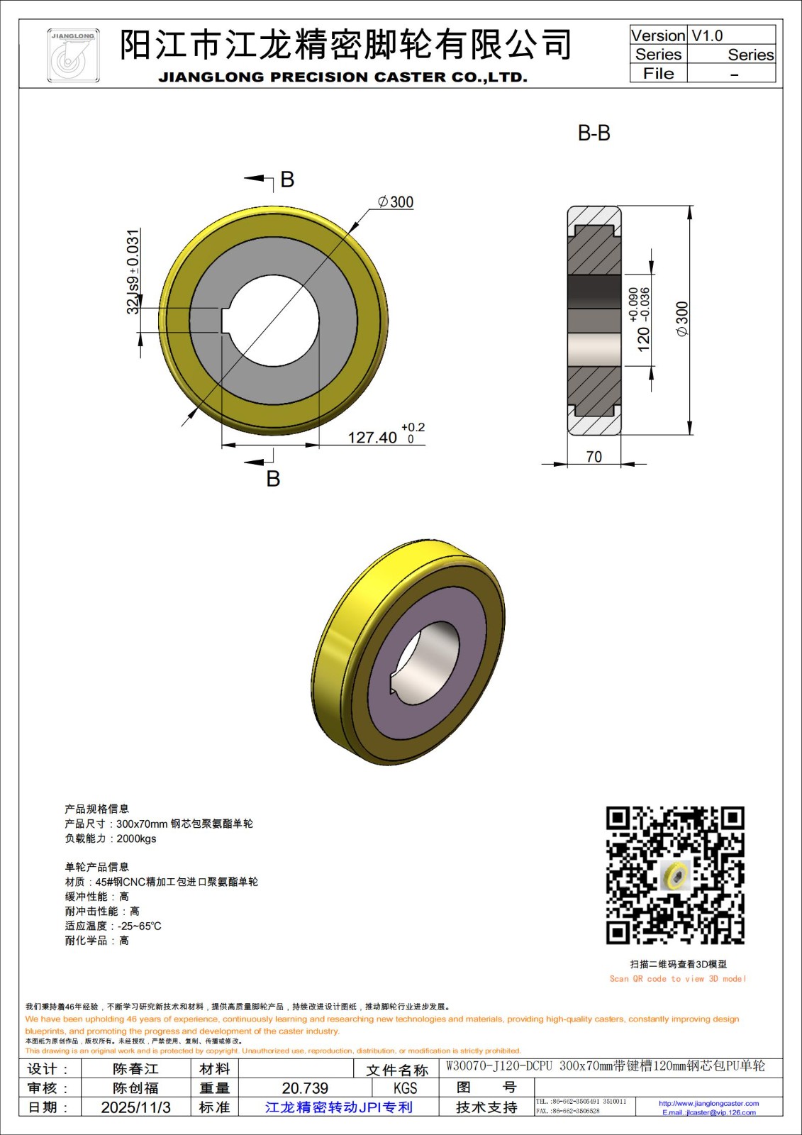 W30070-J120-DCPU 300x70mm带键槽120mm钢芯包PU单轮