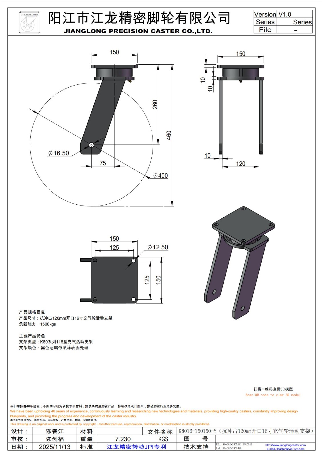 K8016-150150-Y(抗冲击120mm开口16寸充气轮活动支架)
