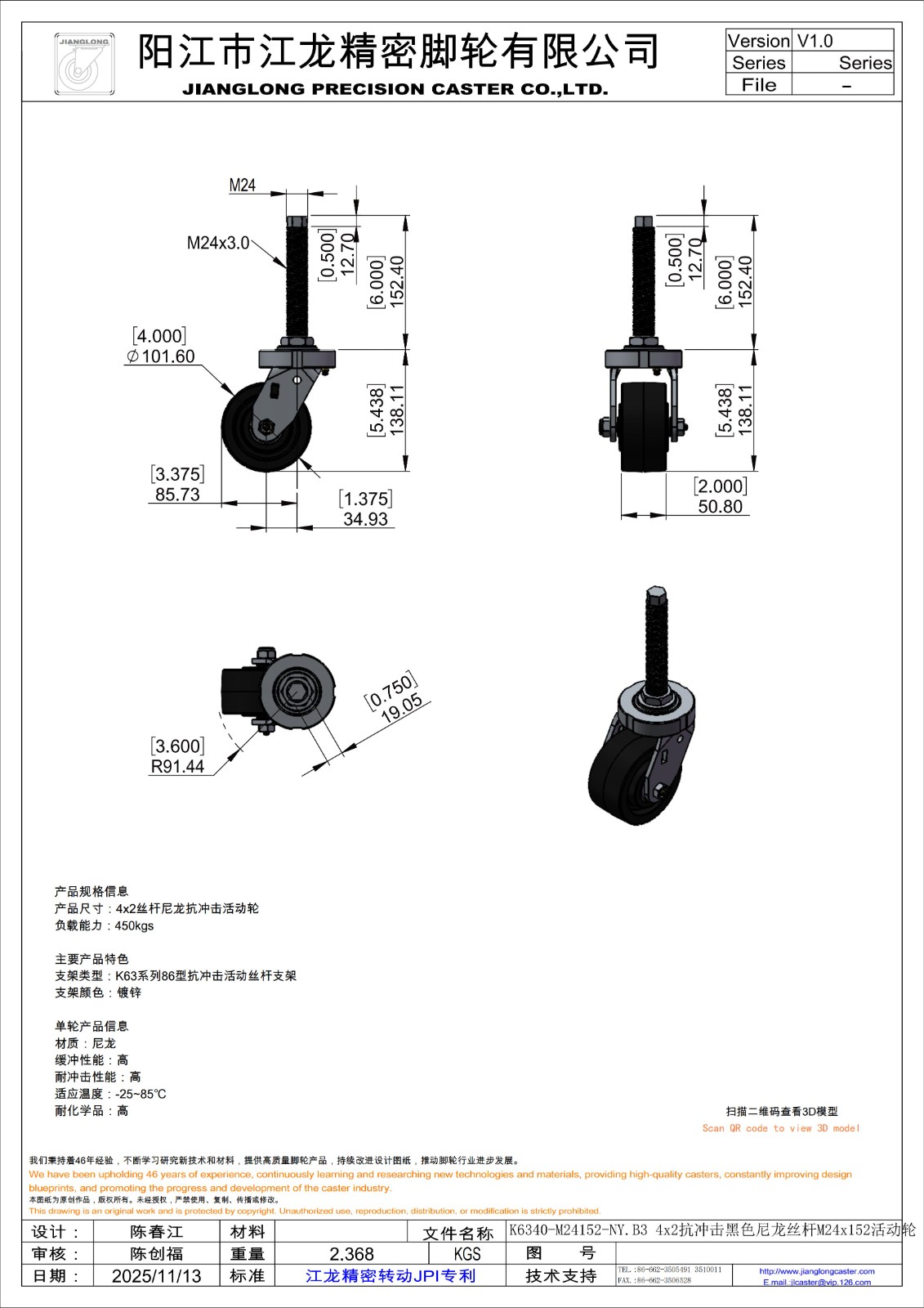 K6340-M24152-NY.B3 4x2抗冲击黑色尼龙丝杆M24x152活动轮
