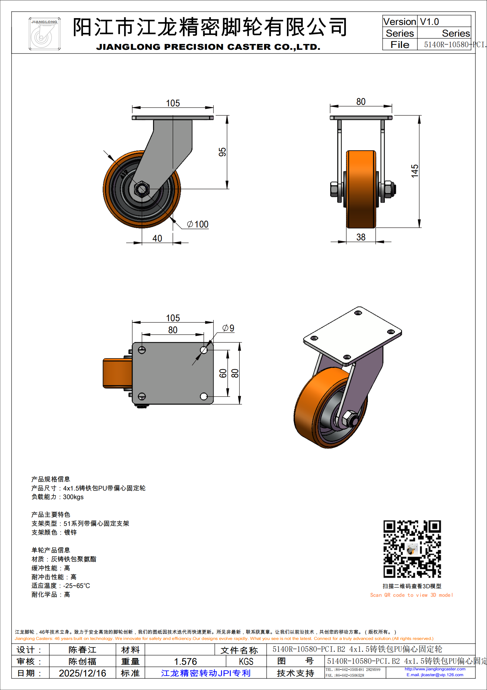 5140R-10580-PCI.B2 4x1.5铸铁包PU偏心固定轮