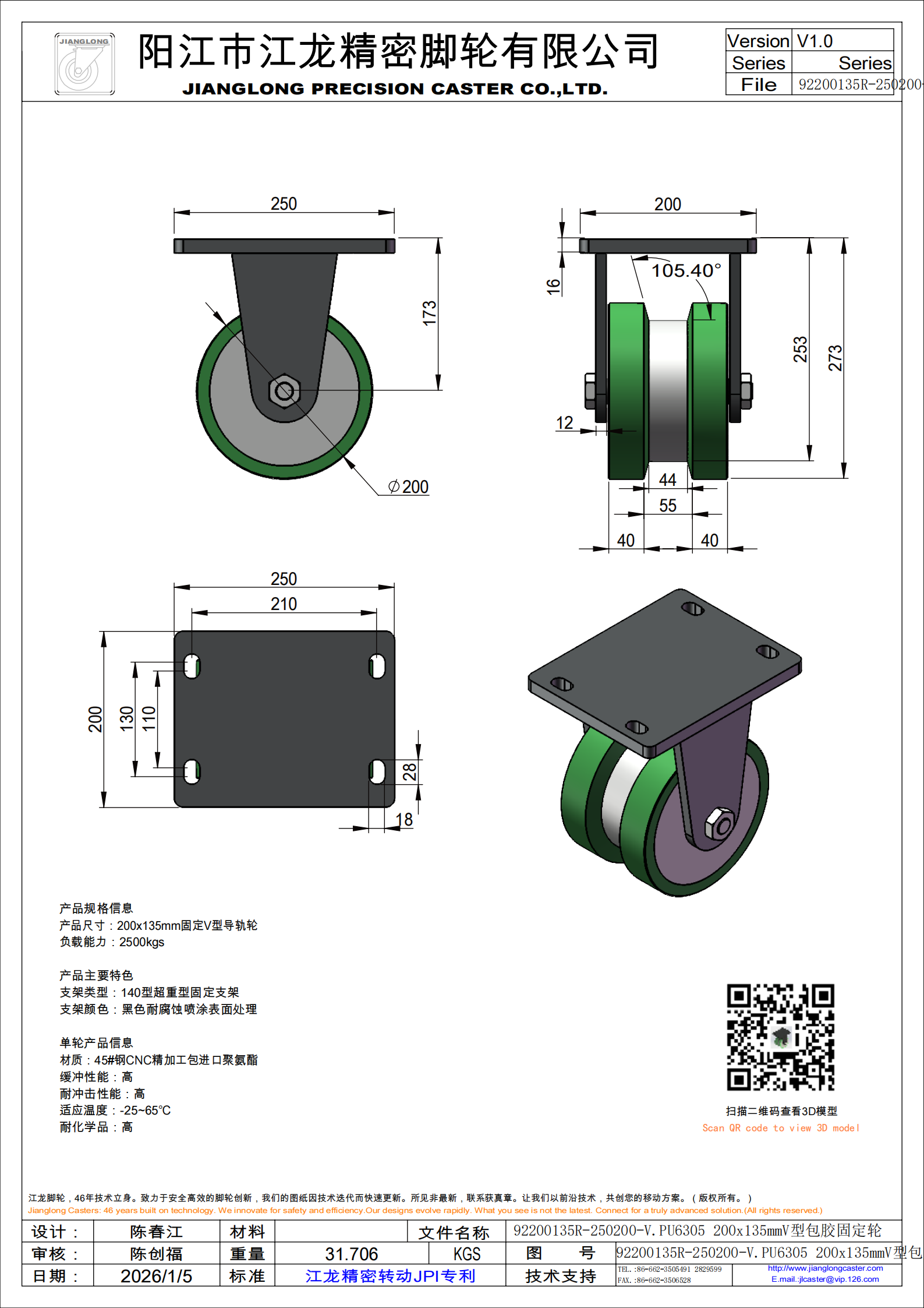 92200135R-250200-V.PU6305 200x135mmV型包胶固定轮
