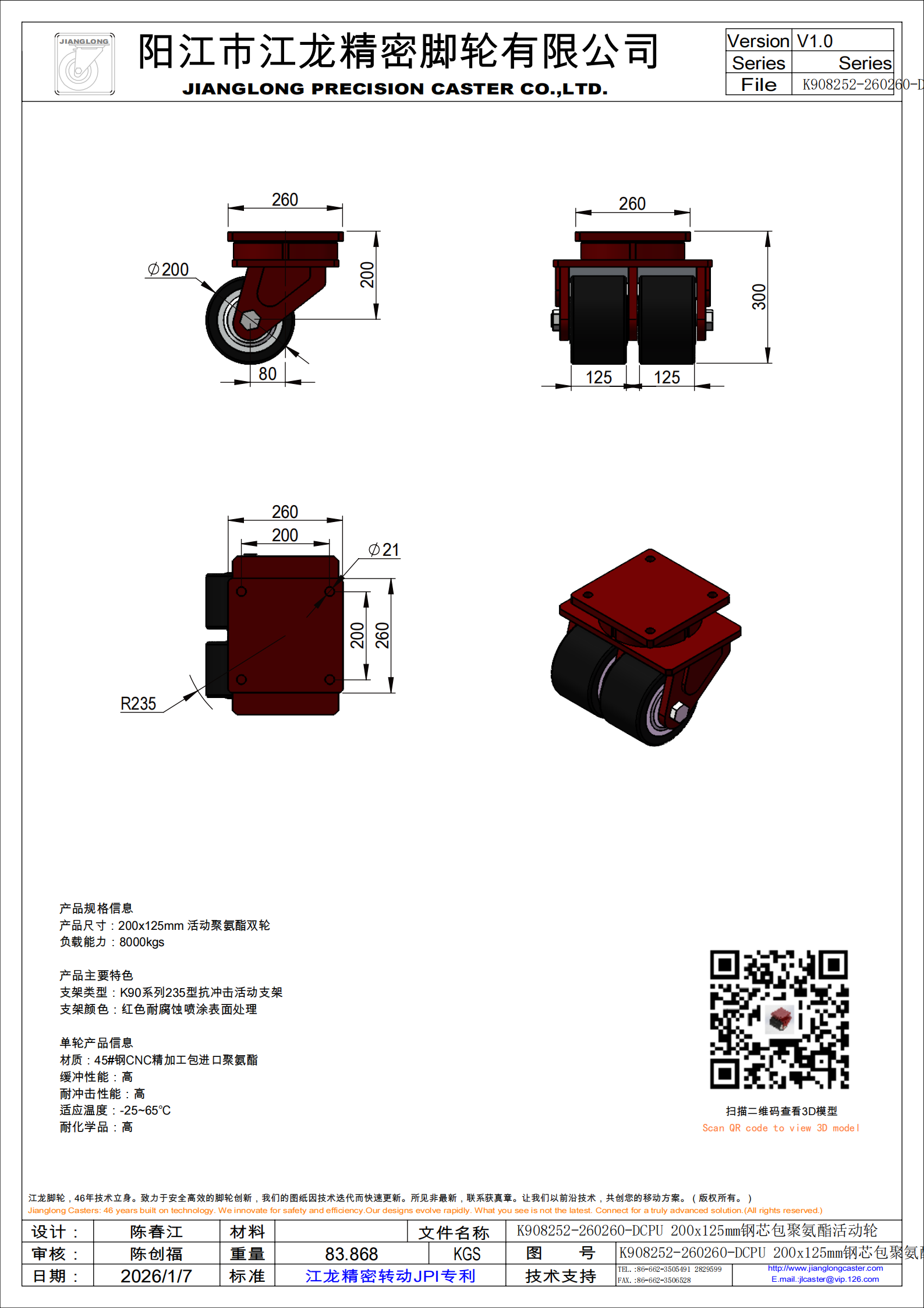 K908252-260260-DCPU 200x125mm钢芯包聚氨酯活动轮