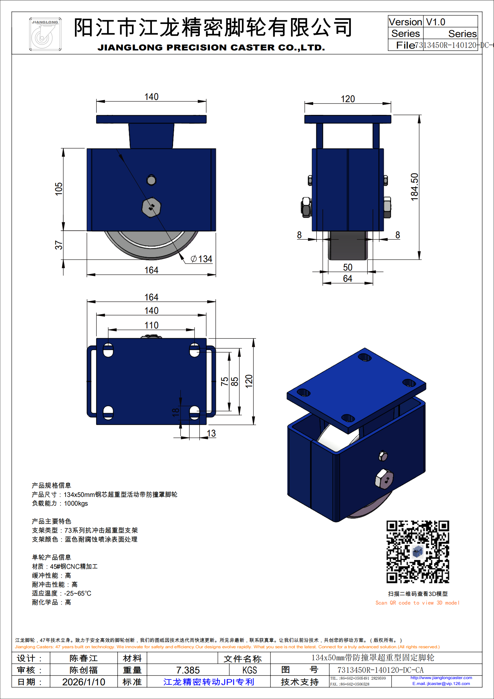 7313450R-140120-DC-CA 134x50mm带防撞罩超重型固定脚轮