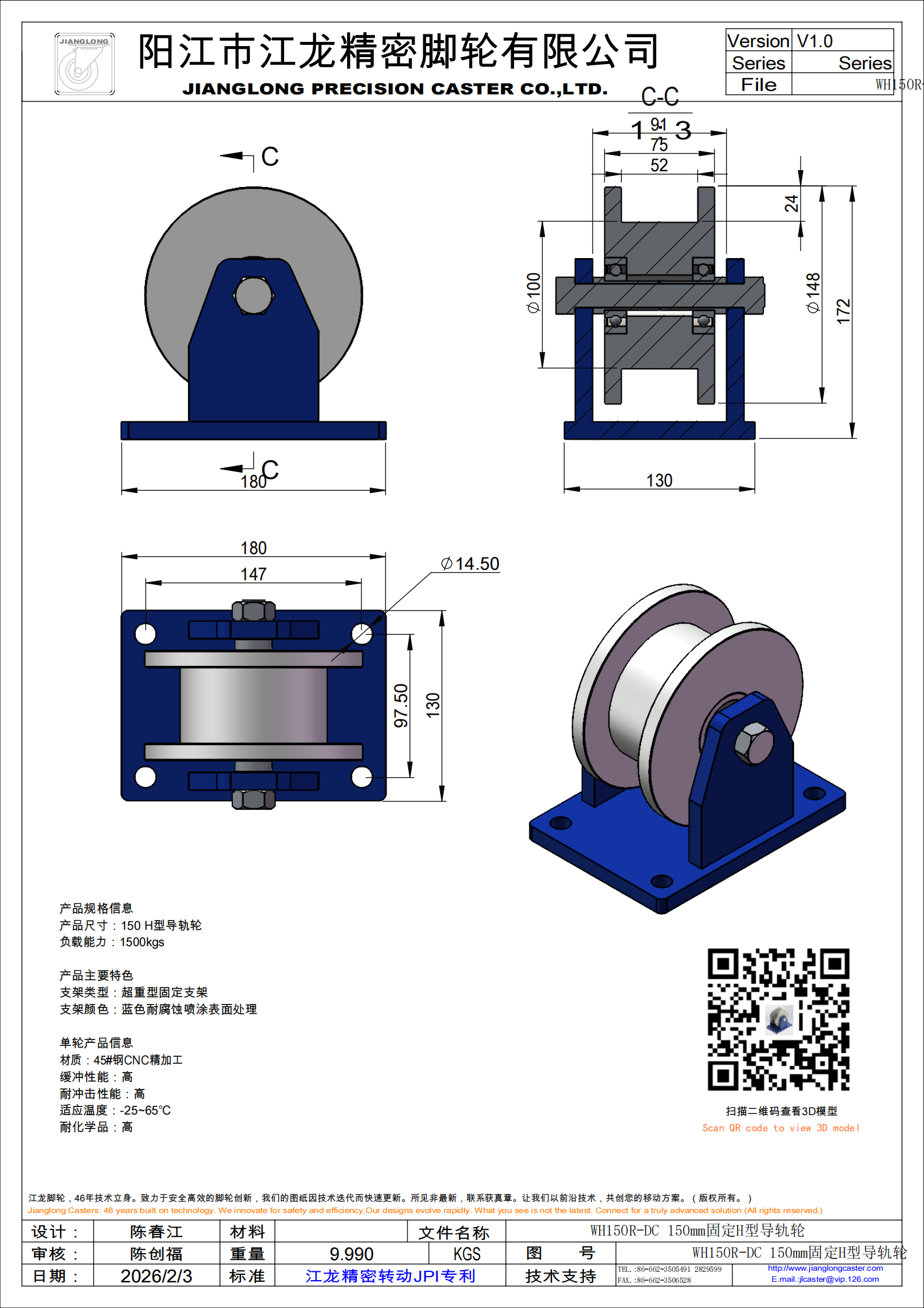 WH150R-DC 150mm固定H型导轨轮