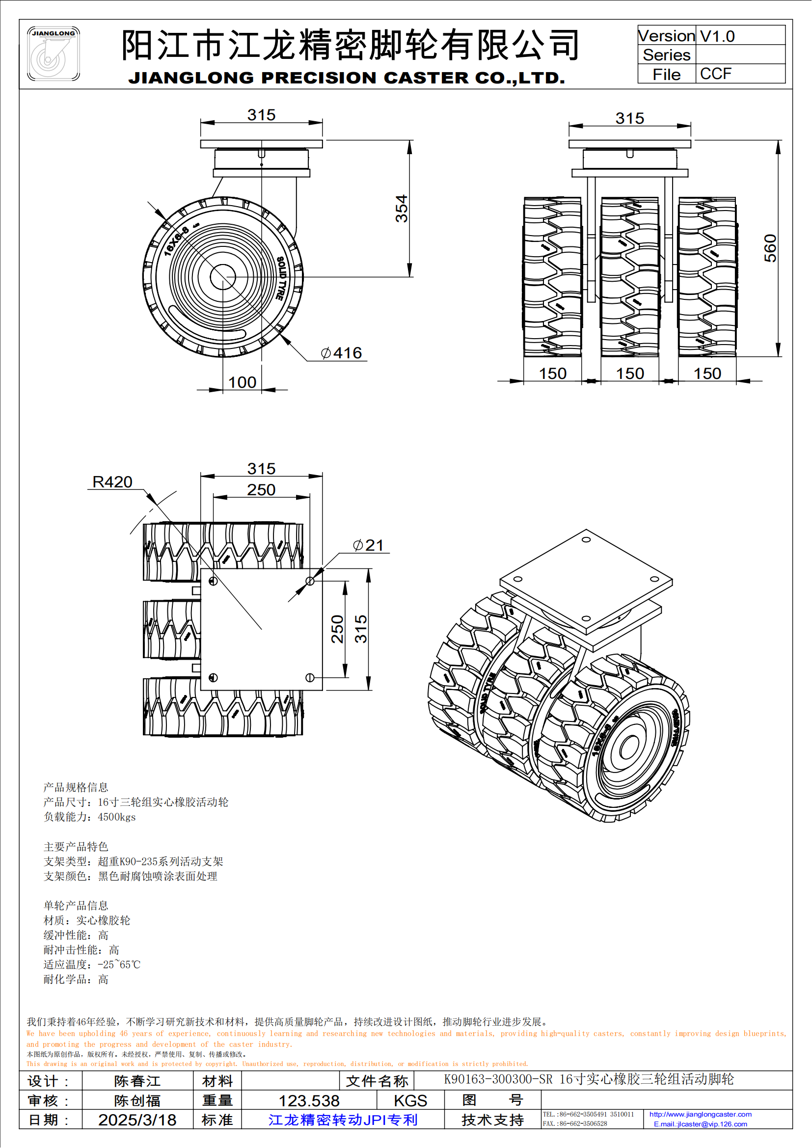 K90163-300300-SR 16寸实心橡胶三轮组活动脚轮