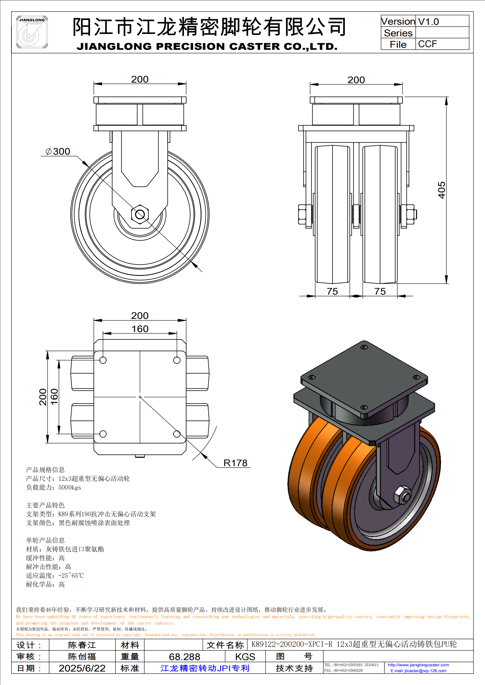 K89122-200200-XPCI-R 12x3超重型无偏心活动铸铁包PU轮
