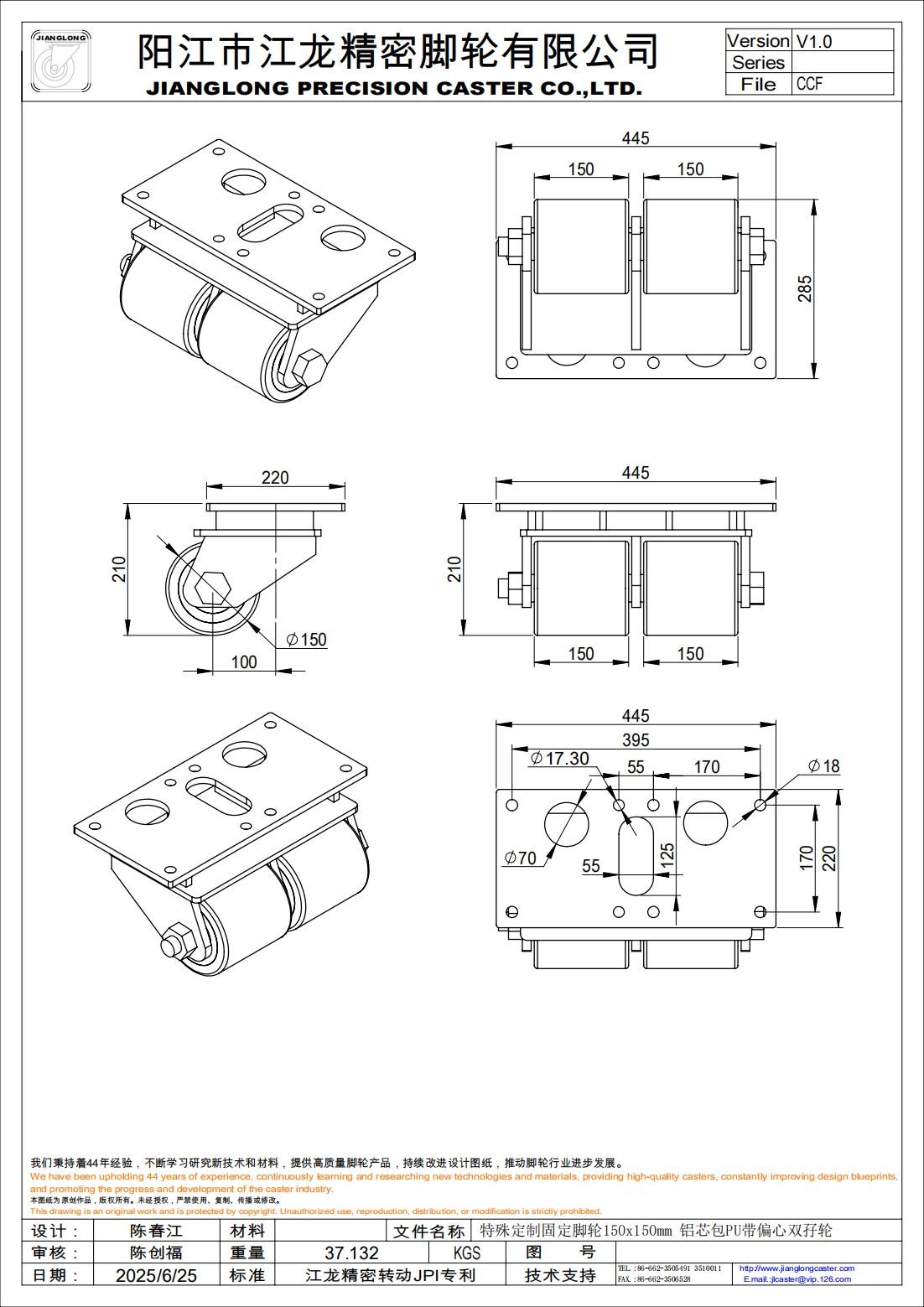 特殊定制固定脚轮150x150mm 铝芯包PU带偏心双孖轮