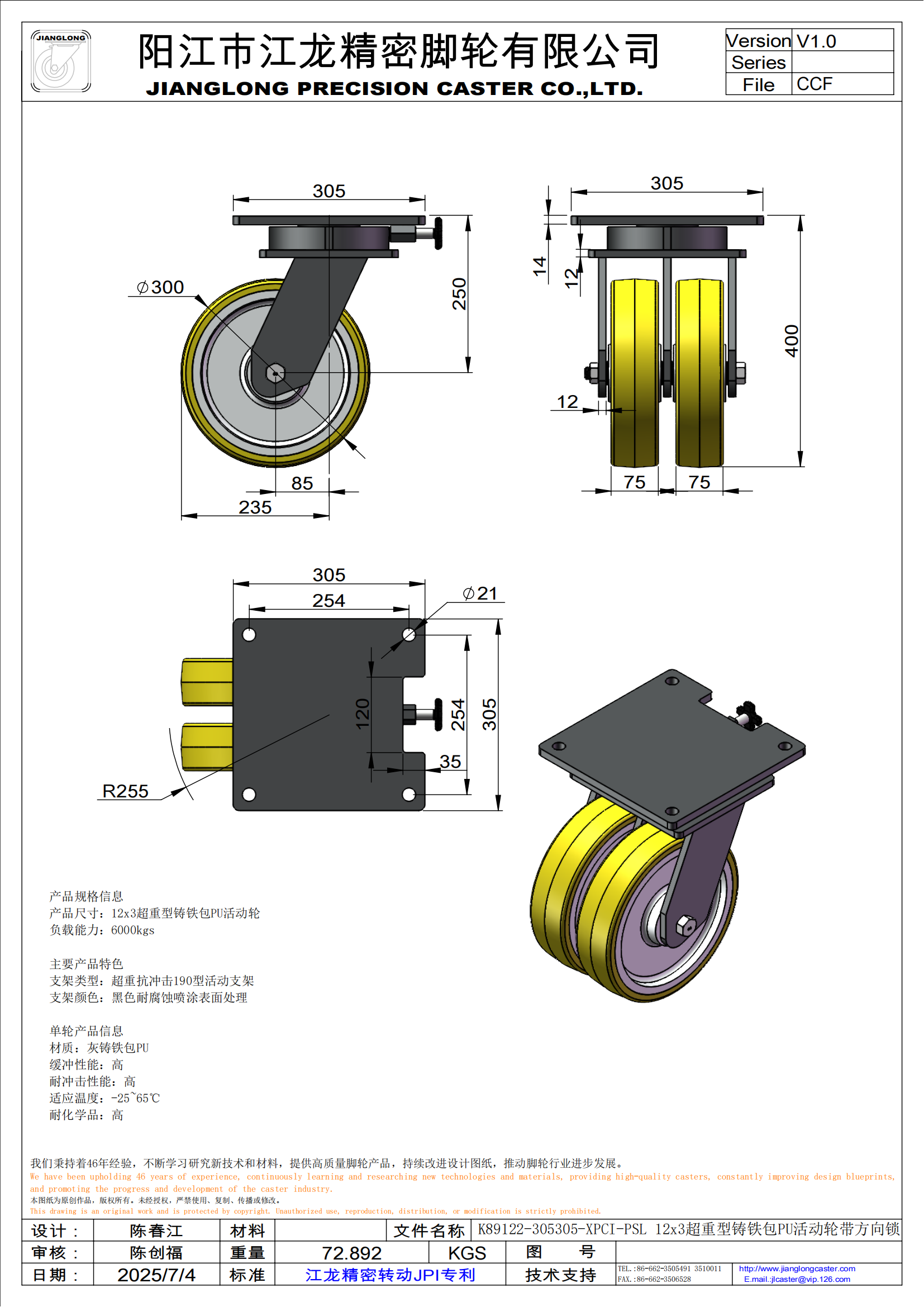K89122-305305-XPCI-PSL 12x3超重型铸铁包PU活动轮带方向锁