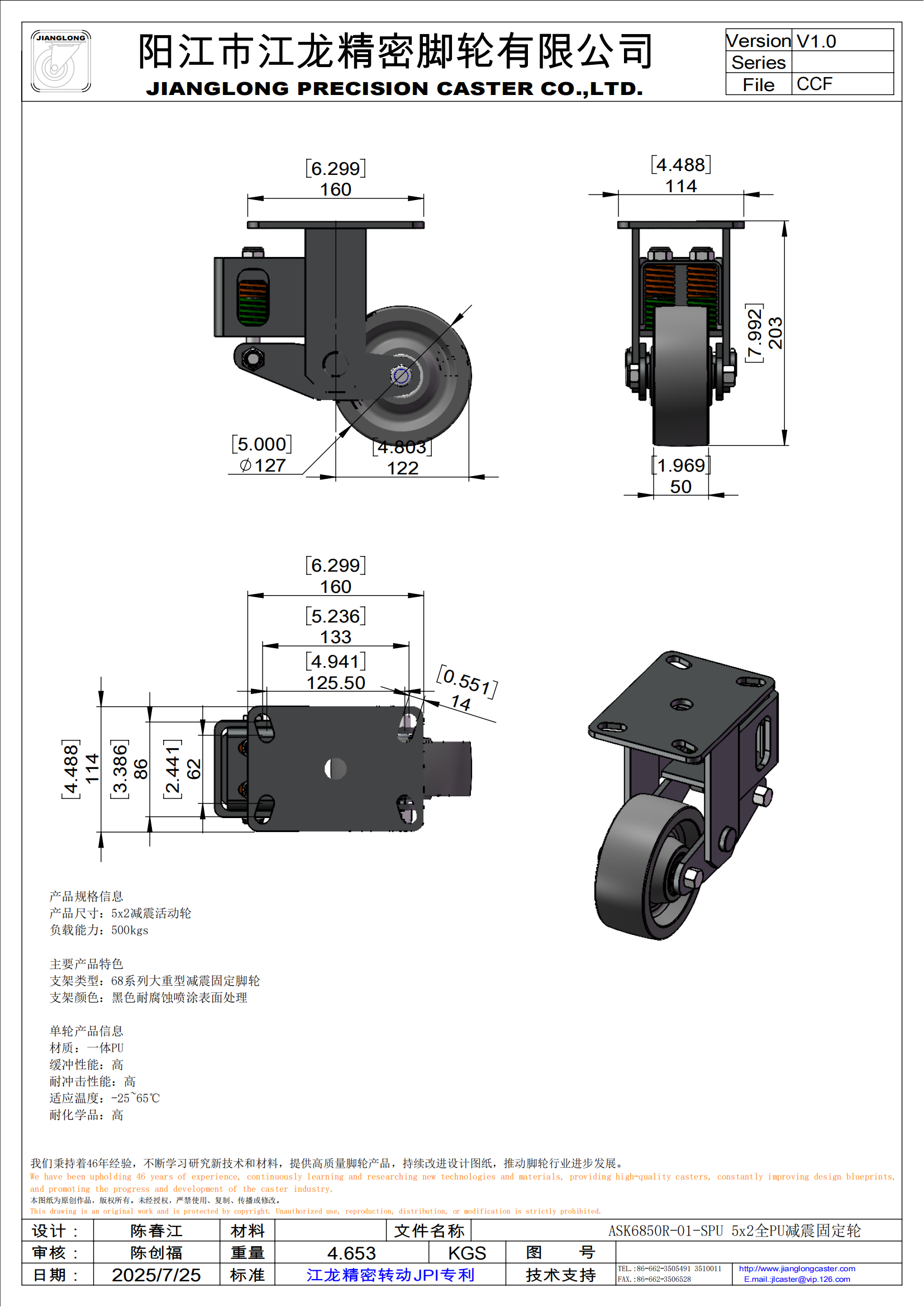 ASK6850R-01-SPU 5x2全PU减震固定轮