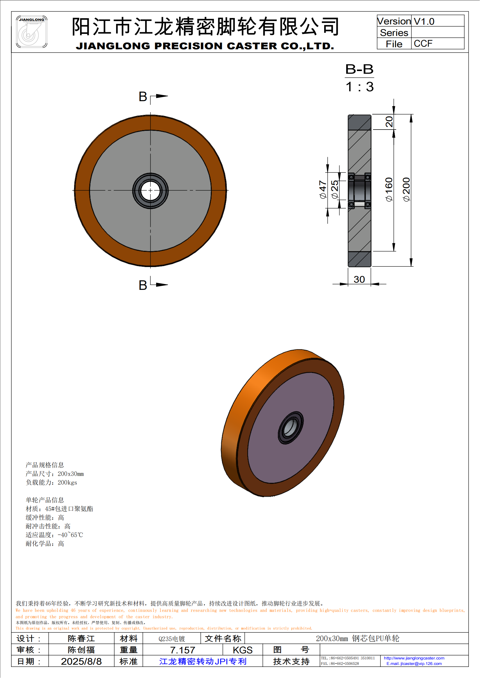 200x30mm 钢芯包PU单轮