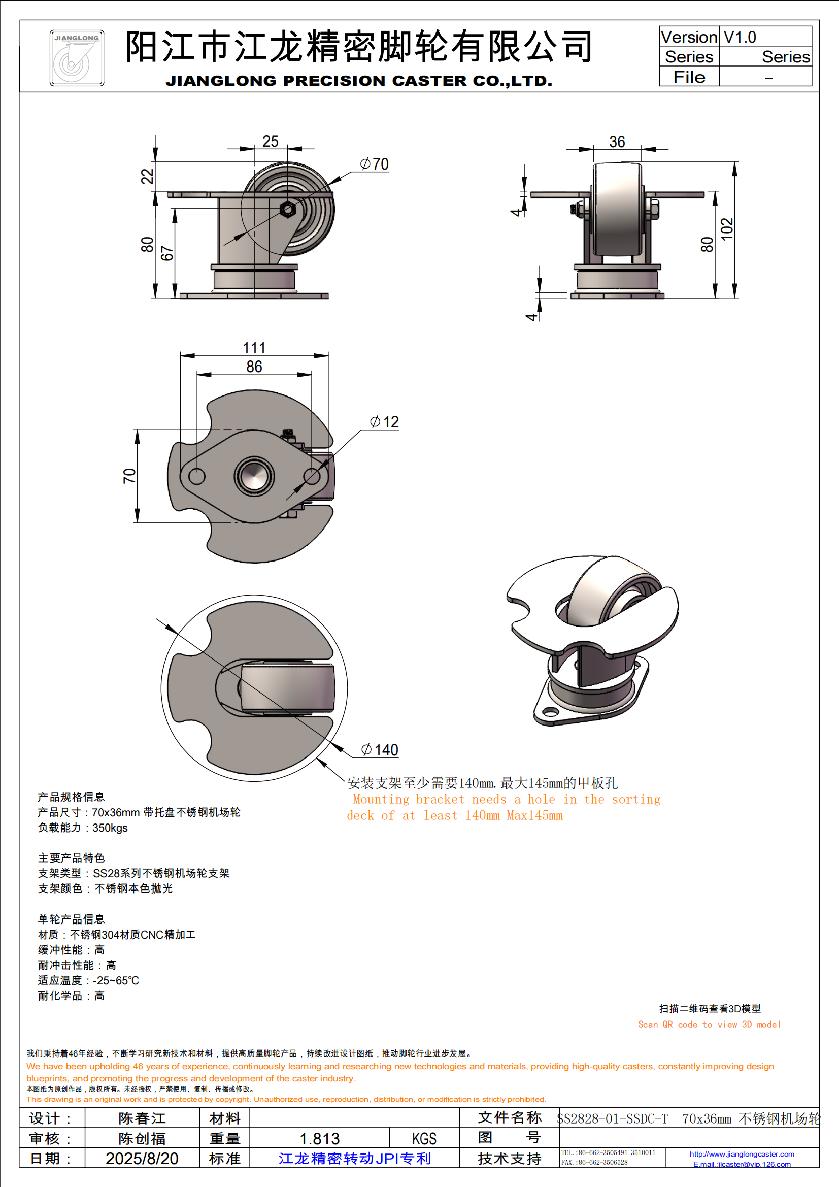 SS2828-01-SSDC-T 70x36mm 不锈钢机场轮
