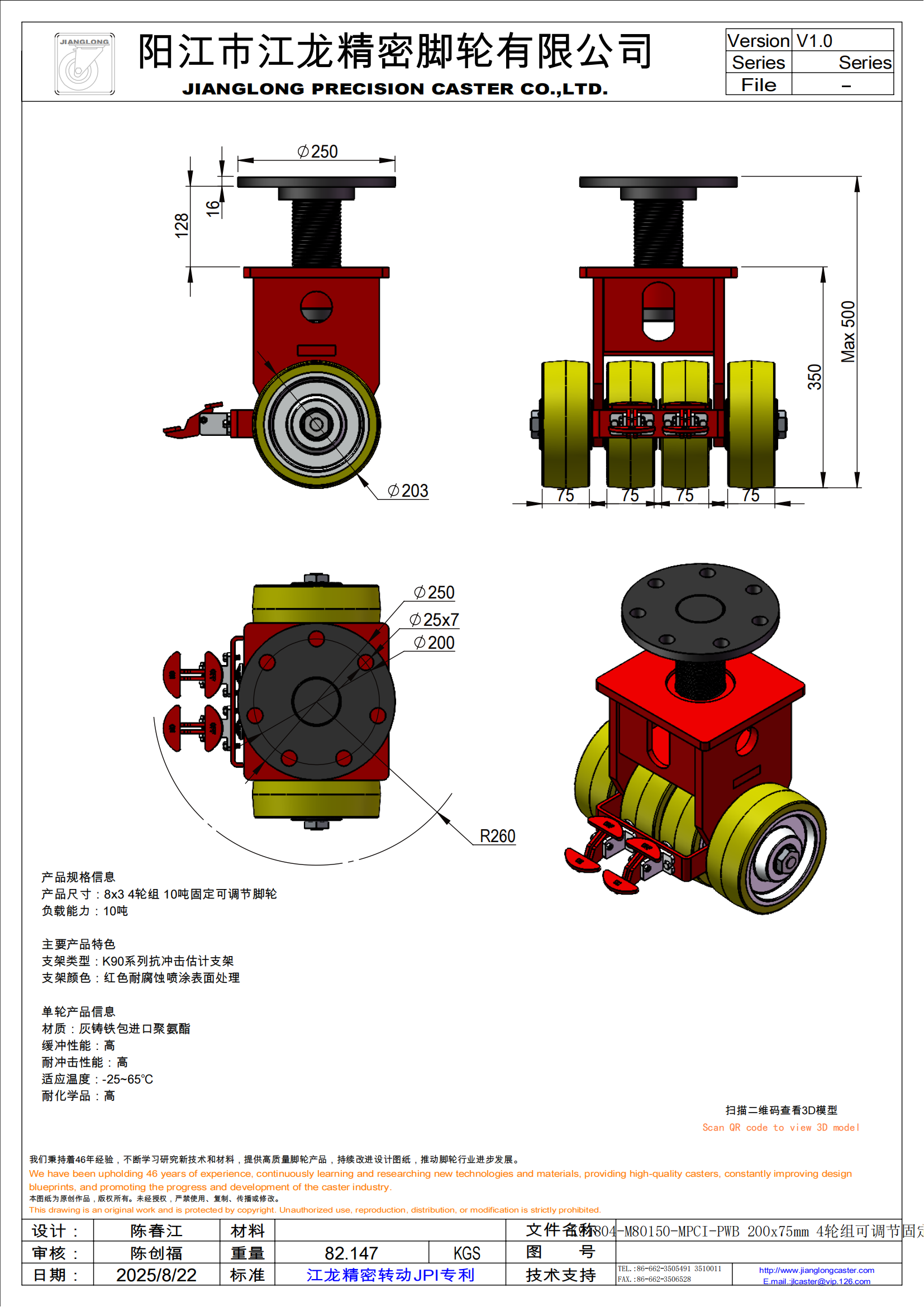 K91804-M80150-MPCI-PWB 200x75mm 4轮组可调节固定轮