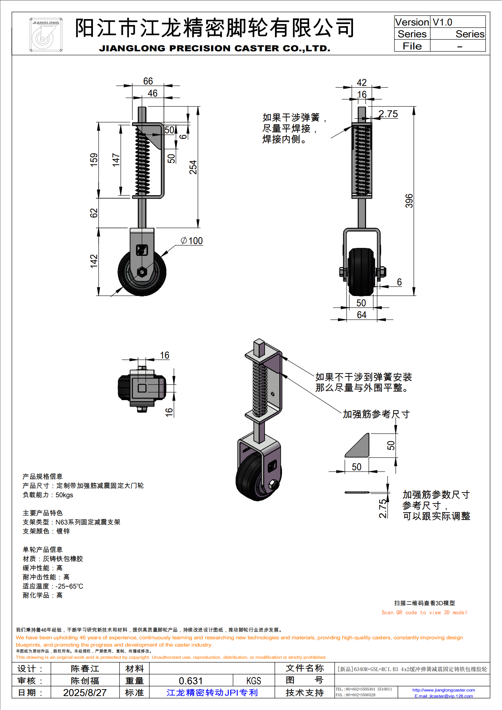 [新品]6340R-GSL-RCI.B3 4x2缓冲弹簧减震固定铸铁包橡胶轮