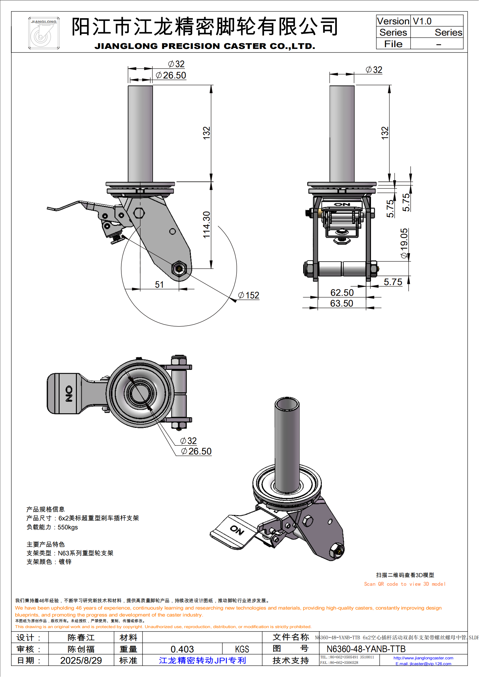 N6360-48-YANB-TTB 6x2空心插杆活动双刹车支架带螺丝螺母中管