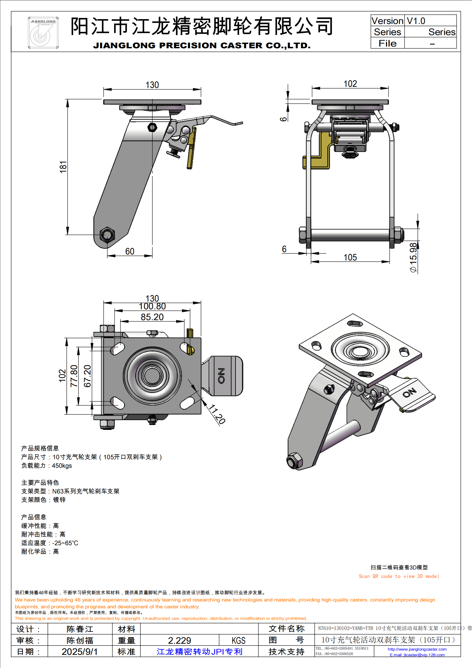N7610-130102-YANB-TTB 10寸充气轮活动双刹车支架(105开口)带螺丝螺母