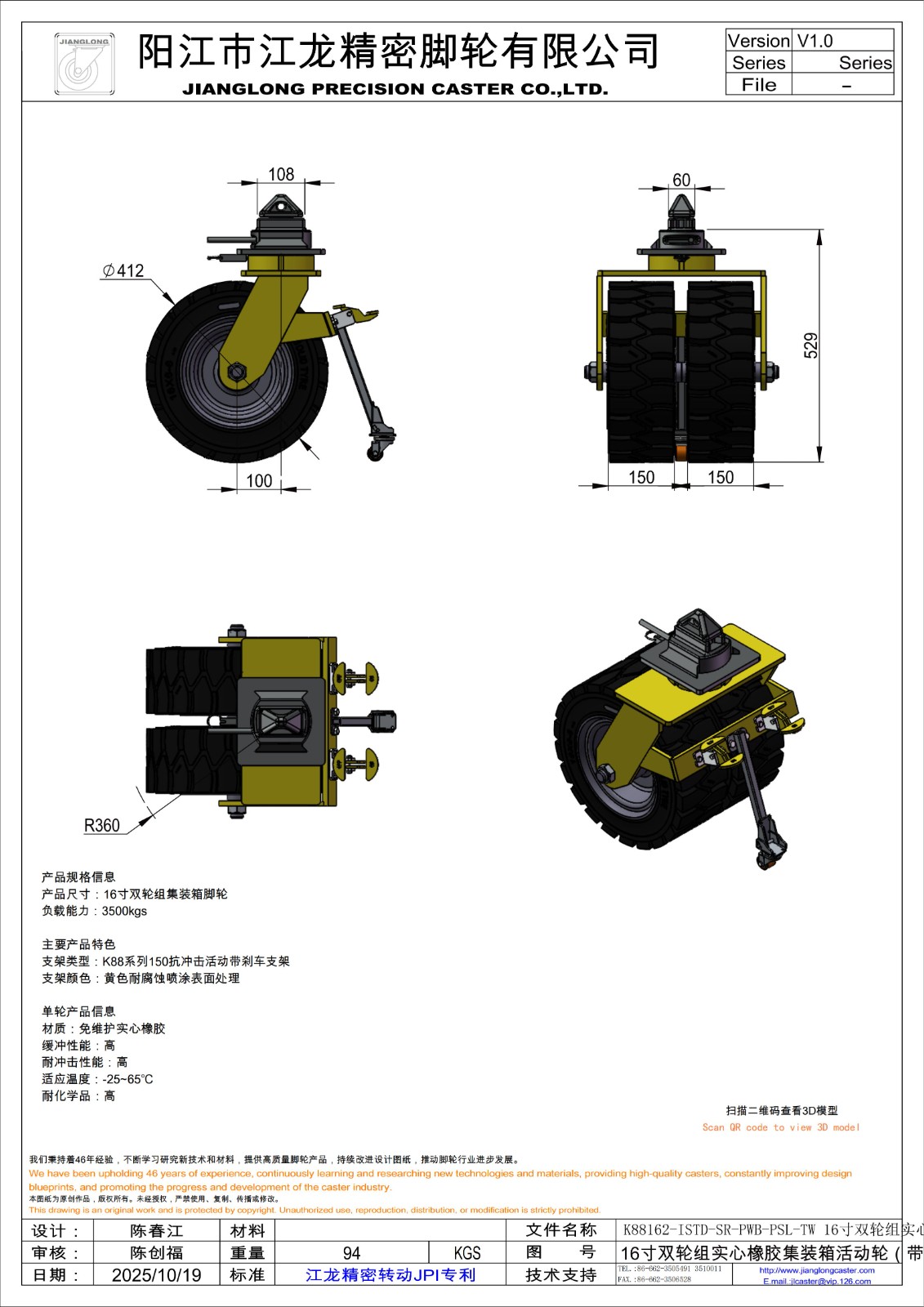 K88162-ISTD-SR-PWB-PSL-TW 16寸双轮组实心橡胶集装箱活动轮(带双刹车 辅助轮