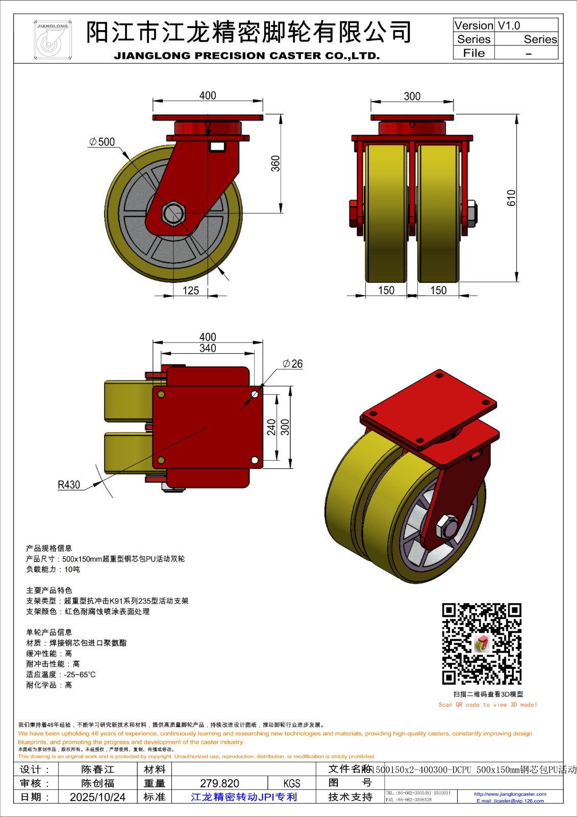 K91500150x2-400300-DCPU 500x150mm钢芯包PU活动轮